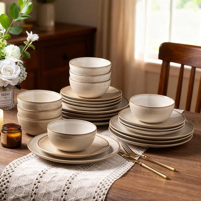 AmorArc Stoneware Dinnerware Sets for 6, 18 Pieces Handpainted Ceramic Plates and Bowls Set, Scratch Resistant Dishes Set, Dishwasher & Microwave Safe, Cappuccino