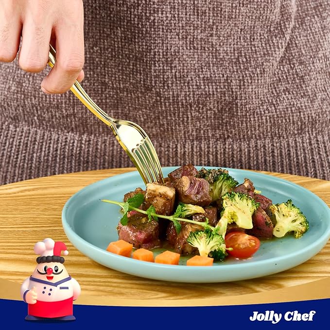 - Sturdy Made: JOLLY CHEF gold disposable forks are crafted from food grade plastic, ensuring durability and safety for all dining requirements. Kindly be advised that these gold forks disposable are not suitable for dishwashers, microwaves, or ovens