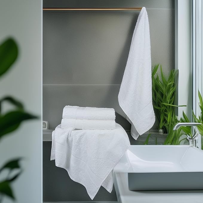 - 𝗦𝗲𝘁 𝗢𝗳 12: Cotton towels Set of 12 pcs in White Color measuring 24 x 50 Inch, with double stitched hems, thick and plush terry makes our bath towel ultra-soft.