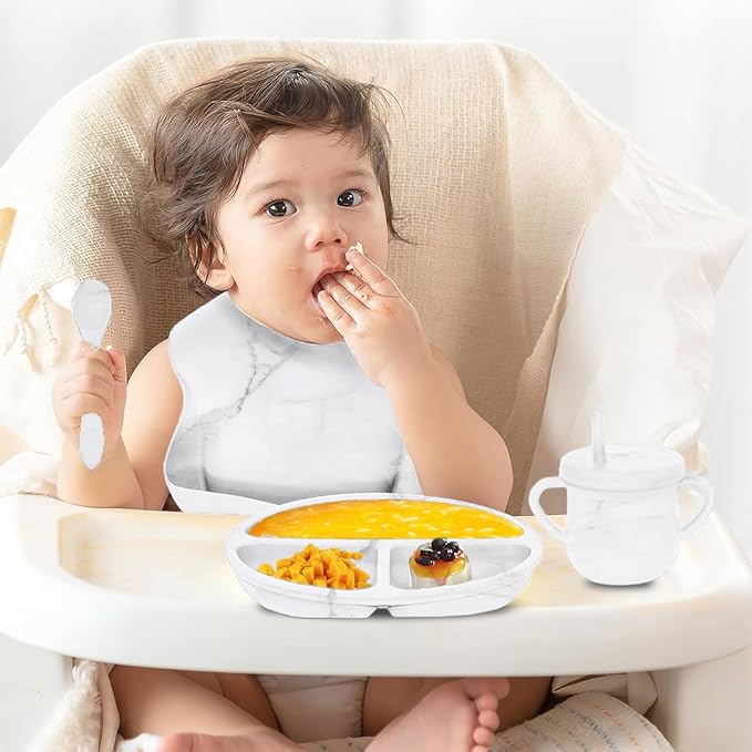 - 9 pcs Silicone Baby Feeding Set :our silicone baby feeding set includes 1 adjustable bib with a food catcher, 1 suction divided plate, 1 suction bowl, 1 training straw sippy cup, and 2 sets of spoon and fork.