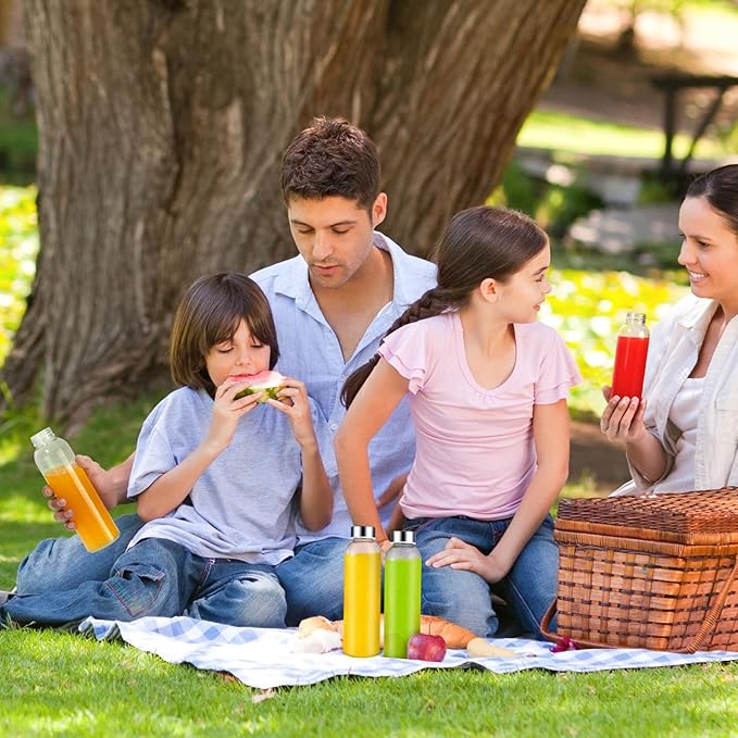 - GLASS BOTTLES FOR JUICING AND MORE: Durable stainless steel lids with air and water-tight seals, so it's completely airtight to keep your beverage fresh without spills. Throw this glass water bottle in your bag and get a healthy start to your day with a juice, smoothie, brew, ice tea, iced coffee, nut milk, Kombucha or water. The 100% leak proof glass bottle will never leave a leaky mess no matter how you place it. The clear glass helps you quickly spot the drink you're in the mood for.