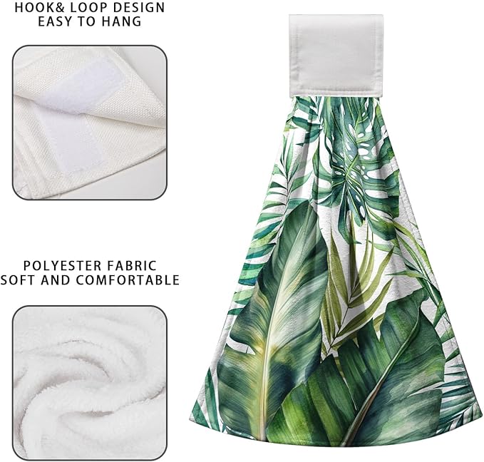 - FUNCTION: Our summer green leaves hanging hand towel is not only soft and absorbent, but it's also built with hook and loop fasteners and a reinforced hang tab, these towels can be hung anywhere around your home for quick-access use