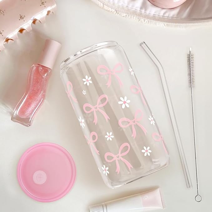 SANDJEST Bow Glass Can, Bows Cup with Lid & Straw, Iced Coffee Aesthetic Cups, Idea Gift for Christmas Birthday Mother Day, Gifts for Women, 16oz