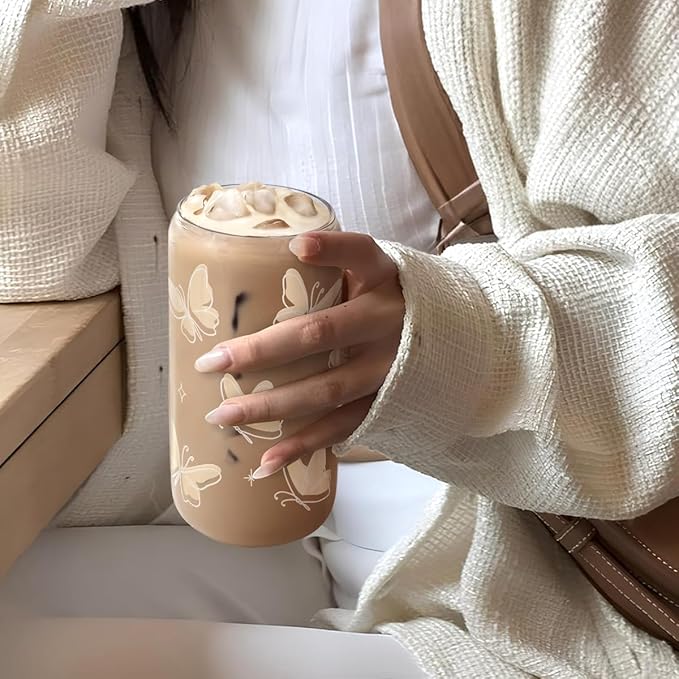 SANDJEST Butterfly Glass Can, Iced Coffee Aesthetic,Cup, Gifts for Christmas Birthday, Gift for Women Girls, 16oz