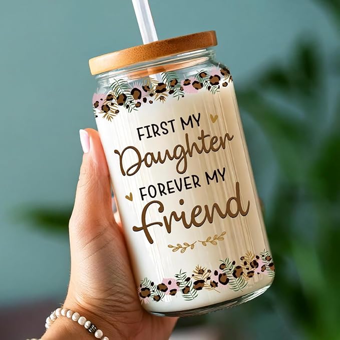 First My Daughter Forever My Friend Glass Cups With Lids And Straws, Mothers Birthday Day Gifts for Mom from Daughter, Best Mom Ever Gifts, Iced Coffee Cup