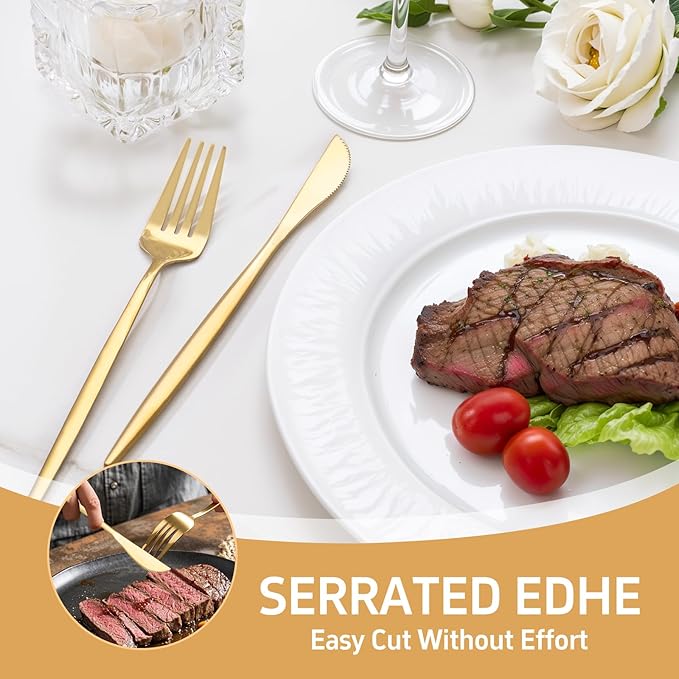 - SAFE USE: The gold cutlery set is edge-passivated to ensure the user experience, avoiding scratches when you use it. The gold silverware set is suitable for daily home, restaurant, party and festival celebrations