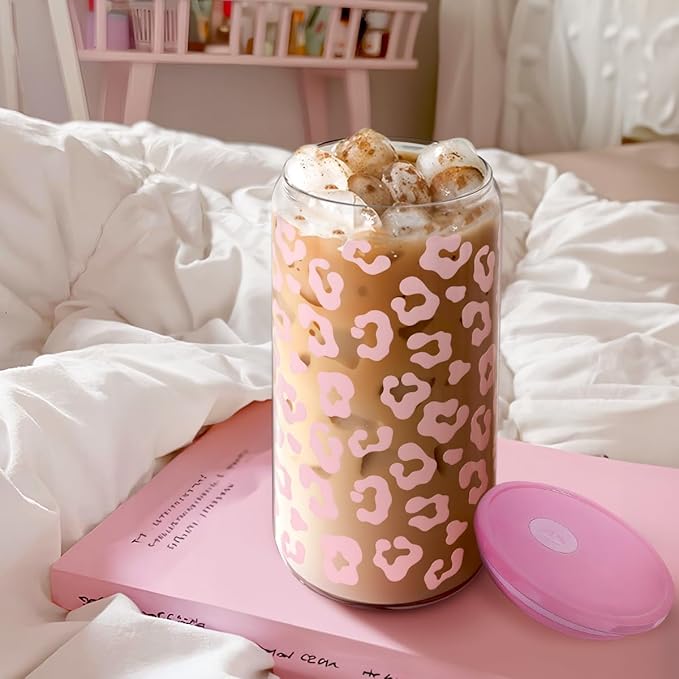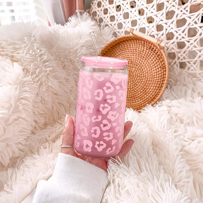 SANDJEST Leopard Glass Bottle, Pink Leopard Print Glass Cup with Lid & Straw, Iced Coffee Aesthetic Glass Can, Gifts for Women, Christmas Birthday Mother's Day