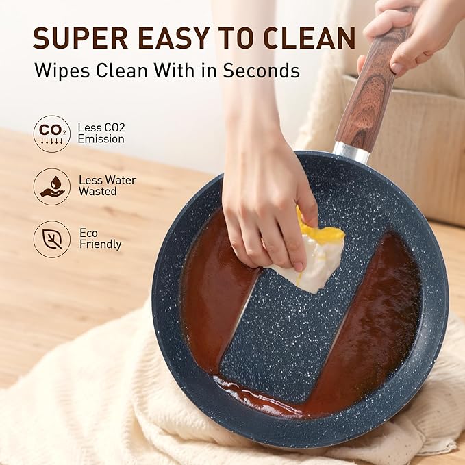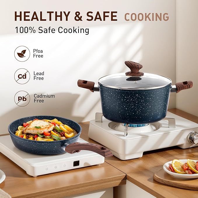 - 𝐄𝐚𝐬𝐲 𝐭𝐨 𝐂𝐥𝐞𝐚𝐧: Say goodbye to scrubbing and soaking. Our cookware features a smooth, easy-to-clean surface, ensuring that tidying up is as simple as enjoying your delicious creations. Easy to clean granite pots and pans