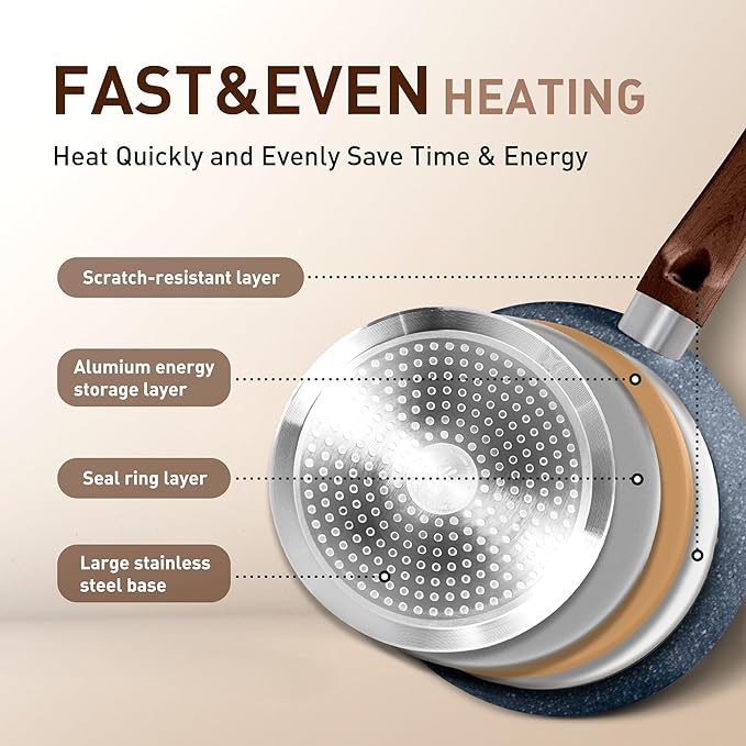 - 𝐓𝐡𝐨𝐮𝐠𝐡𝐭𝐟𝐮𝐥 𝐃𝐞𝐬𝐢𝐠𝐧 𝐟𝐨𝐫 𝐏𝐫𝐚𝐜𝐭𝐢𝐜𝐚𝐥𝐢𝐭𝐲: Anti-scald handles keep your hands safe, while the deeper pan shape allows for versatile cooking techniques, from stir-frying to simmering. Versatile cookware set for various cooking methods