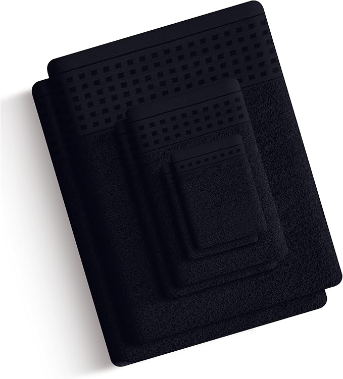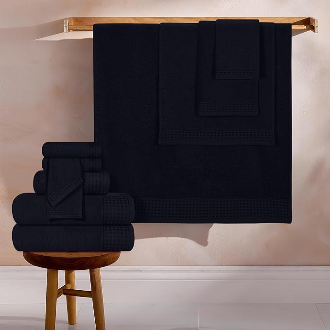 GLAMBURG Towels for Bathroom, 100% Cotton Towel Set, Contains 8 Soft Bath Towel, 8 Hand Towels, 8 Wash Cloths - Compact Absorbent Lightweight & Quickdry - 24 Piece Bathroom Towel Set - Black