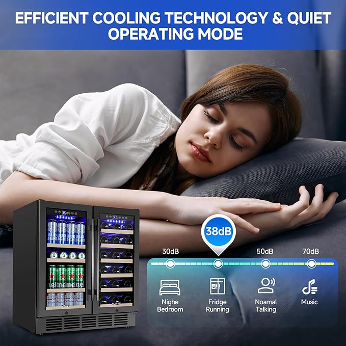 - 2-In-1 Dual Zone and Upgraded Large Capacity -Use our dual zone wine beverage refrigerator with two independent cooling zones. Left zone cools beverage to 35-50°F and right zone maintains temperature of wine at 41-64°F, allowing you to set and maintain different temperatures for each beverage. Upgraded 30 inch fridge can capacity of up to 30 bottles and 110 cans,meeting your more storage needs