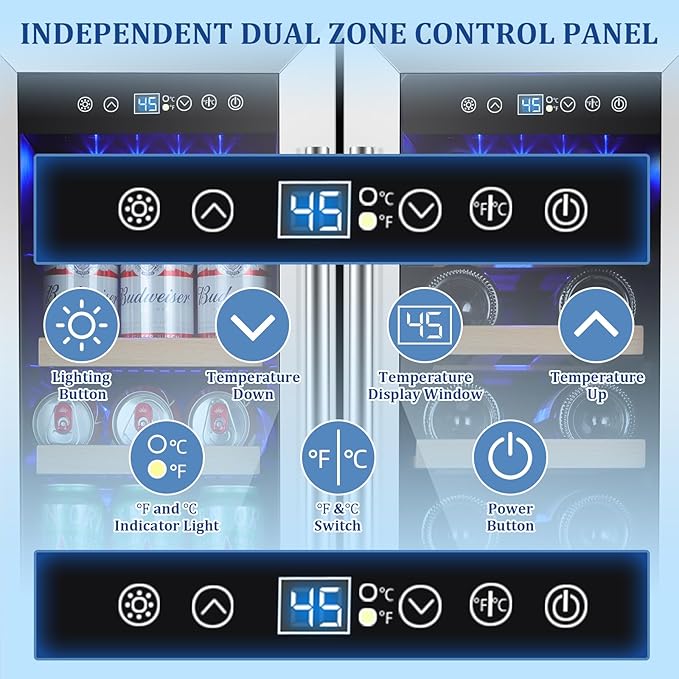 - Dual Zone Beverage Cooler with Intelligent Temperature Control - Our wine and beverage refrigerator features two separate cooling zones, with the left zone at 35-50°F and the right zone at 41-64°F. You can choose the right storage zone depending on the type of beverage. Equipped with a dual-zone independent smart touch screen, you can control the temperature to make sure your drinks are stored to perfection in the refrigerator to ensure the best flavor