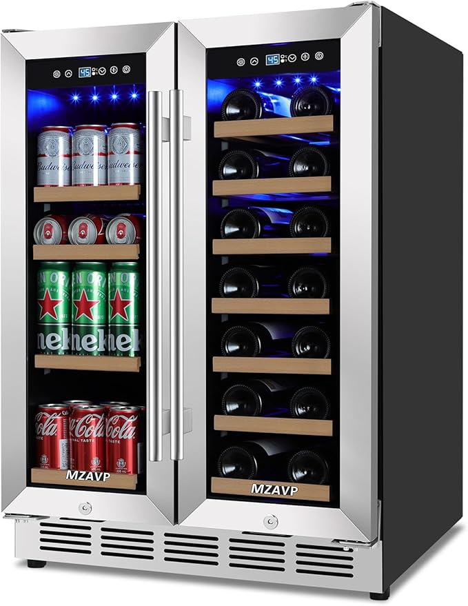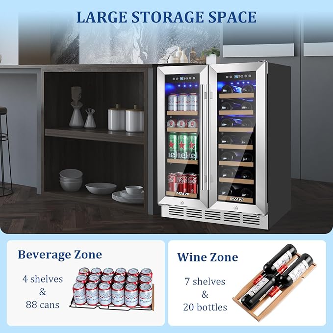- Large Capacity of Beverage and Wine - MZAVP Dual Zone Beverage Refrigerator holds up to 20 standard Bordeaux bottles and 88 standard 12 oz/330 ml cans. It can fulfill the need to store wine, soda, beer, and water at the same time. Equipped with free height adjustable mobile shelves, it makes it easier for you to select and arrange your favorite wines and beverages