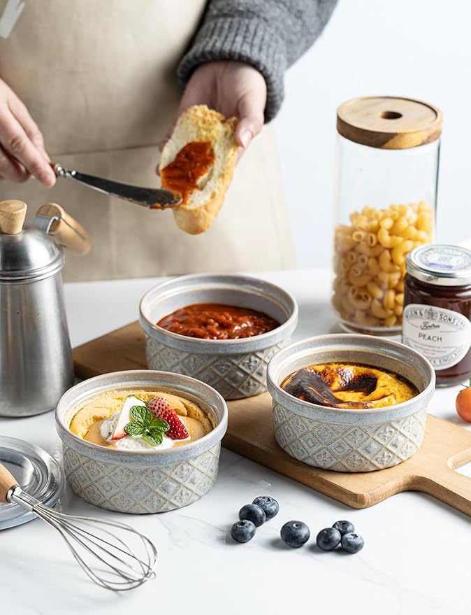 - Airtight Lid for Enhanced Freshness: These soufflé dishes feature an airtight lid designed to keep your food fresher for longer. The built-in date marker makes it simple to monitor storage times, ensuring you never lose track of how long your dishes have been stored. Whether you are using them for baking, desserts, or as mini serving bowls, these lids help maintain optimal freshness