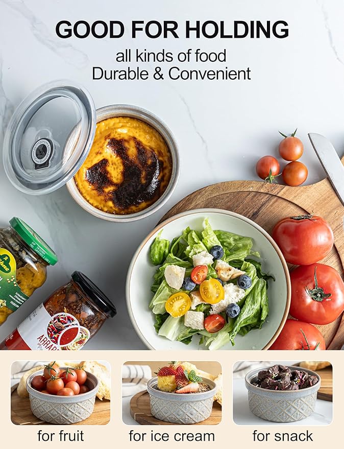 - Versatile Use Oven-safe Ramkein Set: These porcelain ramekins with lids are not just for one specific purpose; they shine in various roles - perfectly suited for baking, serving, and food preparation. From presenting a gourmet savory souffle to dishing out a rich, sweet dessert, their versatility allows you to explore countless culinary possibilities