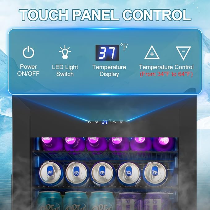 - SMART TOUCH CONTROL PANEL: The mini beverage fridge comes with an intuitive touch panel for effortless temperature adjustment, perfectly suited for modern lifestyles. With a wide temperature range (34 °F–64 °F), you have full control over your cooling experience.