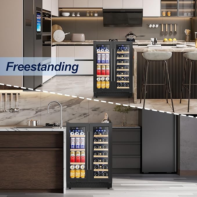 - 24-INCH & 4.6 CU.FT. LARGE CAPACITY: The wine and beverage fridge has a 40% increased capacity, 24-Inch & 4.6 Cu.Ft. space can hold 20 standard bottles of wine and 88 cans of standard beverages. The wine fridge is equipped with a built-in deodorizing activated carbon purification system, effectively reducing odors inside the wine cellar and preventing any impact on the wine’s taste. It's perfect for home bars, kitchens, living rooms, offices, or entertainment spaces. It’s easy to use, modern, and elegant.