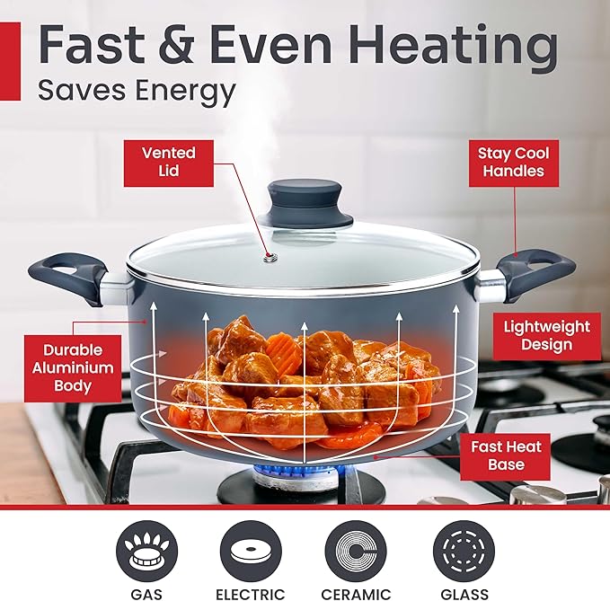 - Even Distribution Of Heat - The premium aluminum construction of the non stick frying pans will deliver consistent cooking results. Heat is conducted and distributed quickly yet evenly, saving you cooking time and energy requirements, as only low to medium heat is needed. The premium coating prevents rust and makes cleaning a breeze. It also includes comfort easy-grip handles that stay cool during cooking.