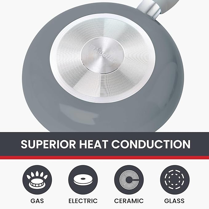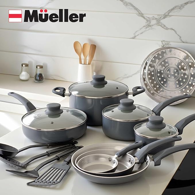 Mueller 16-Piece Healthy Stone Pots and Pans Set Non Stick, Non Toxic Ceramic Cookware Set, Dishwasher Safe, w Frying Pans, Sauce Pan, Steamer, Vac-Free Vented Glass Lids, Kitchen Utensils, Slate