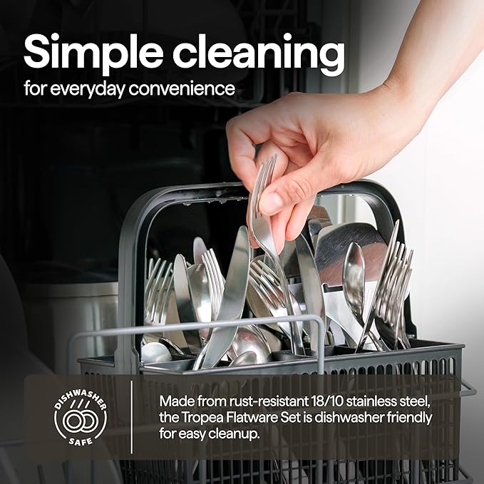 - Dishwasher Safe & Built to Last: Made for convenience, this 18/10 stainless steel flatware set is dishwasher safe and retains its beautiful shine wash after wash, eliminating the burden of handwashing.