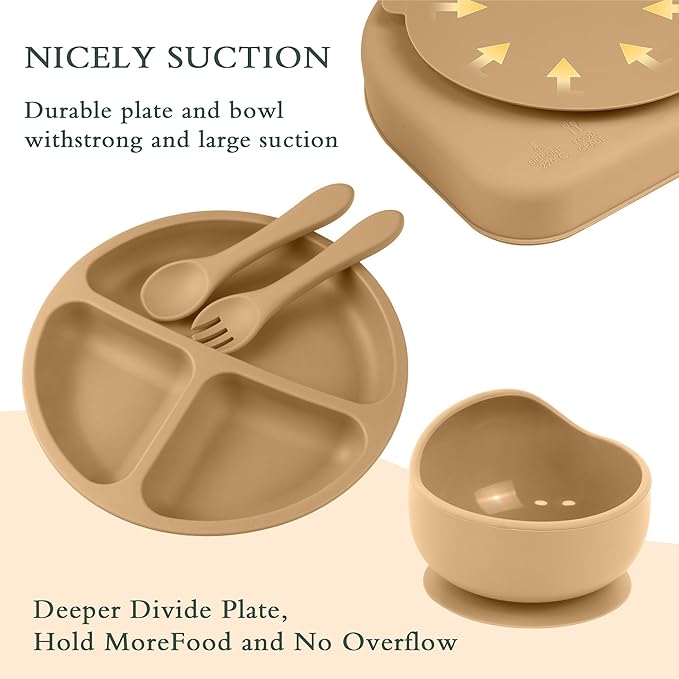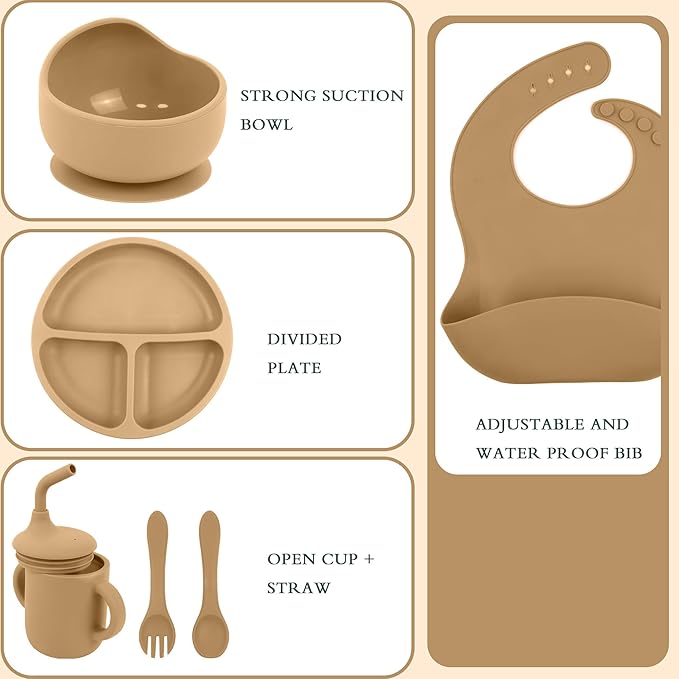 6-Piece Baby Feeding Set, Silicone Baby Mealtime Kit for Food-Grade Strong Suction Baby Plate+Baby Cup+ Bib+Fork+Spoon+Bowl, Toddler Eating Essentials Washable Parenting Gift Idea (Yellow)