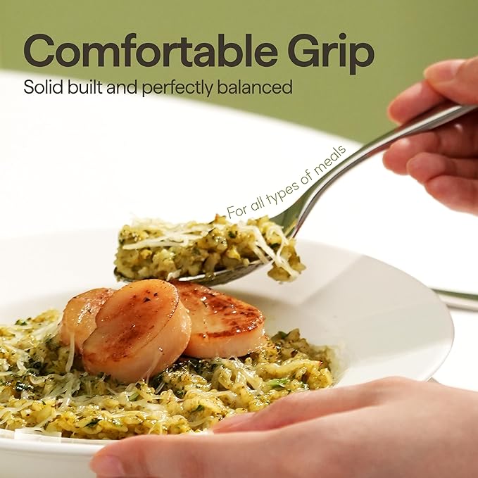 - Designed for Comfort & Precision: Experience an elegant and well-balanced kitchen flatware set crafted with the optimal thickness for a sturdy, premium feel. The smooth, rounded edges ensure a comfortable grip, while the precisely serrated dinner knives offer effortless cutting, making every meal feel like a fine dining experience.
