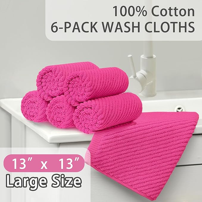 VOOVA & MOVAS Pink Washcloths (6PC, 13"x13") - 100% Cotton | Lightweight | Thick | Quick Dry | Soft | Absorbent, Luxury Towels for Face, Fluffy Wash Cloths for Bathroom, Towel Gift Set, Hot Pink