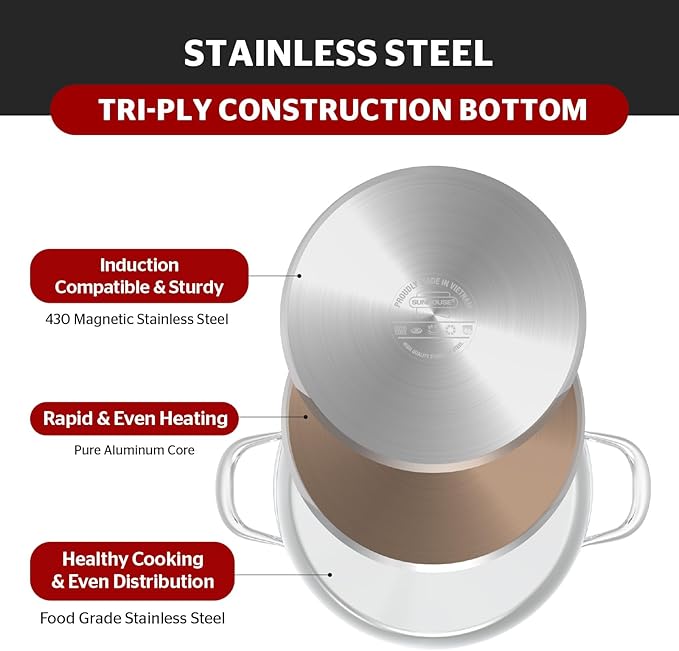 - [Heat Distribution] - Our stainless stock pot is carefully crafted with 3-ply base, so you can cook your meals perfectly with the optimal degree of effective heat distribution. Whether you’re simmering, boiling, or stewing, you can trust that this stock pot is the perfect tool for you.