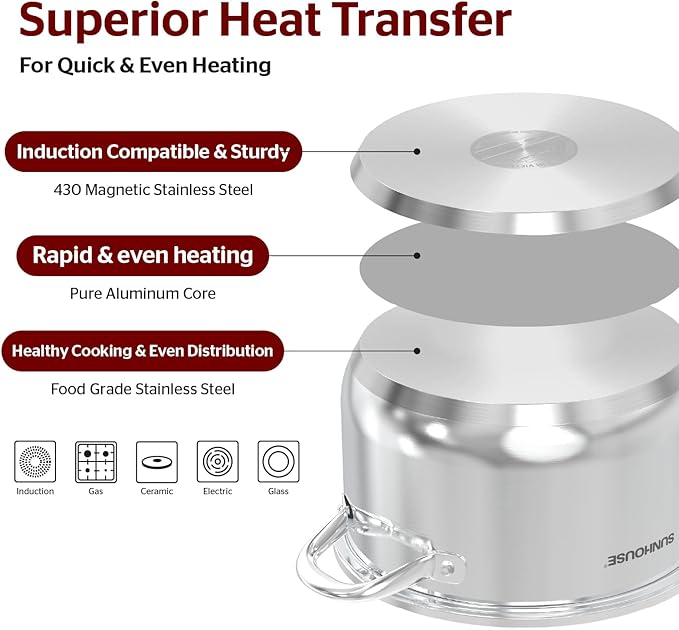 - [Tri-Ply Stainless Steel for Fast Heating] – The 3-ply bonded construction, which alternates layers of stainless steel and aluminum, ensures even heat distribution, preventing hot spots and promoting faster cooking. This design helps save both time and energy.