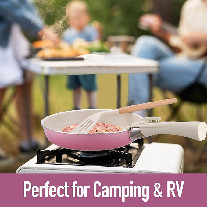 20pcs Ceramic Cookware Set Nonstick, Detachable Handle Pots and Pans Set, Non Toxic,No PFAS & PTFE & PFOA, Dishwasher/Oven Safe, RV Kitchen Set Removable Handle for Cooking, Pink