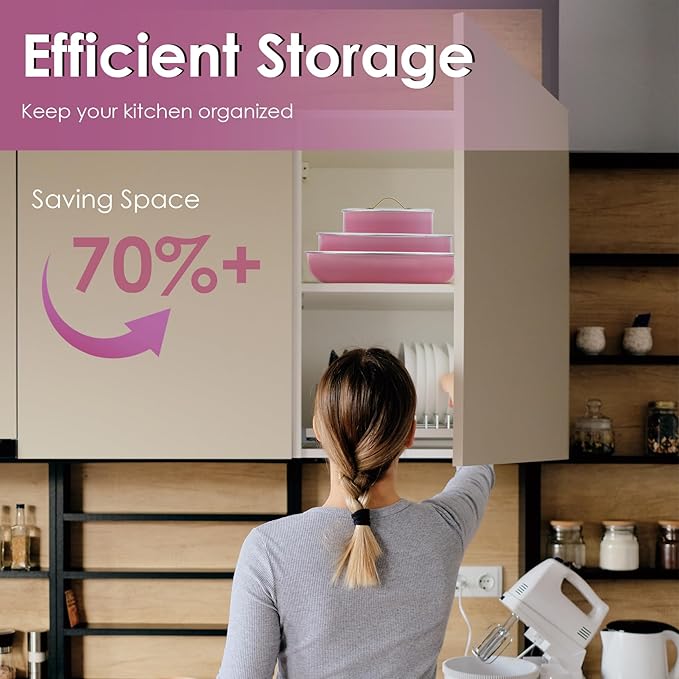- Space Saving: ONGIFT stackable pots and pans set with detachable handles keep the kitchen organized and tidy, saving 70% of space, storage is simple. Perfect for kitchen and an ideal choice for RVs or campers