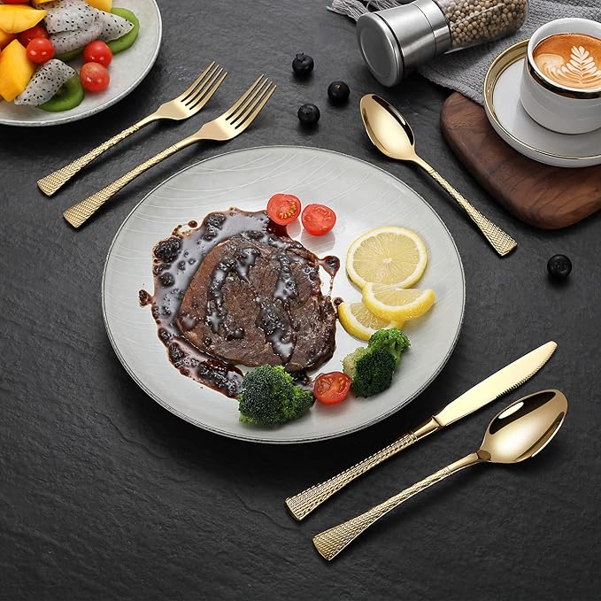 Lemeya Hammered Gold Silverware Set for 8,Stainless Steel 40-Piece Modern Cutlery Set,Mirror Polished Heavy Duty Flatware Set Utensil Set,Knives Spoons and Forks Set,Dishwasher Safe