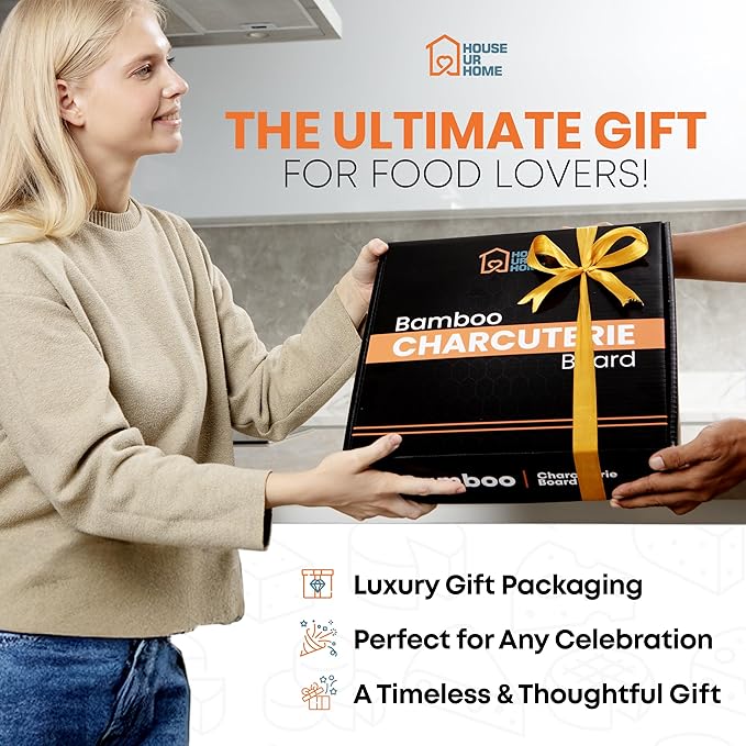 - Naturally Durable & Eco-Friendly - Crafted from premium, sustainably sourced bamboo, this charcuterie board gift set is water-resistant, odor-resistant, and built to last. The smooth, non-porous surface is easy to clean while maintaining its elegant finish for years of use.