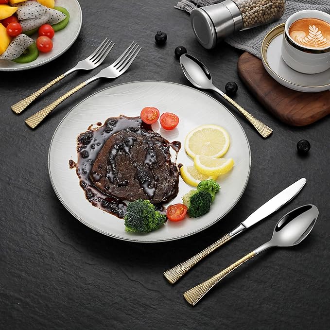 Lemeya Hammered Silver Gold Silverware Set for 8,Stainless Steel 40-Piece Modern Cutlery Set,Mirror Polished Heavy Duty Flatware Set Utensil Set,Knives Spoons and Forks Set,Dishwasher Safe