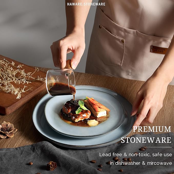 HaWare Dinnerware Sets, 24-Piece Stoneware Plates and Bowls Set, Dish Set for 8, Ceramic Dishware for Home Restaurant, Chip and Scratch Resistant, Microwave and Dishwasher Safe, Reactive Foggy Blue