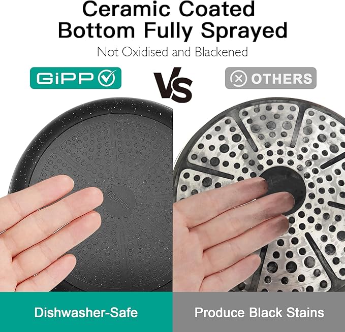 - 100% Non-Toxic & Healthy - Made with a healthy ceramic coating free from PTFE, PFAS, PFOA, PFOS, APEO, lead, cadmium and SGS Approved. GiPP ceramic Pots and Pans Set is safe for your family and the environment