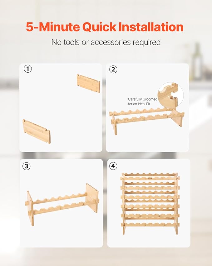 - Effortless Assembly: Assemble the wine storage rack in just 5 minutes—no tools, nails, or screws required. Ensure proper part alignment during assembly. For security, remove all bottles before repositioning the rack