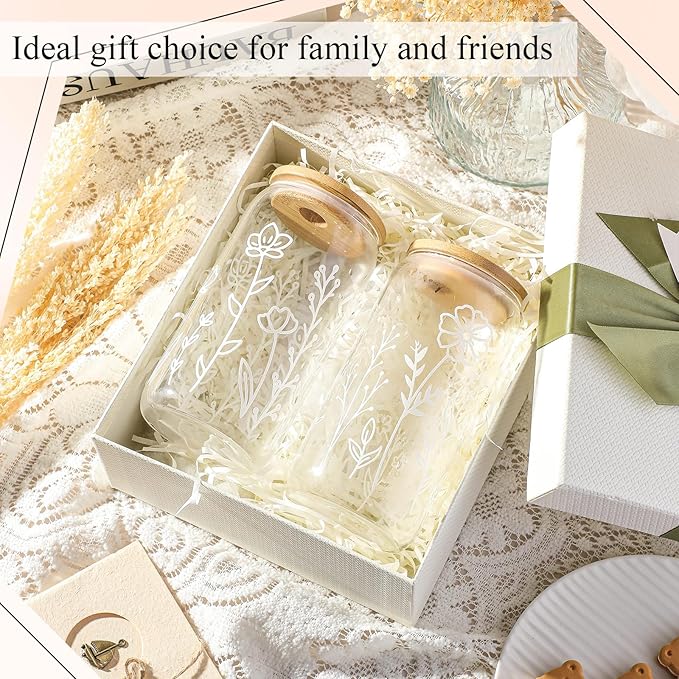 - Boho Floral Glass Tumbler Set: the package contains 2 pieces of 16 oz flower glass cups, printed with different wildflower patterns, 2 matching bamboo lids, 2 reusable elbow glass straws and 2 straw brushes; It can be applied repeatedly and given as a gift, and it is a very practical combination set; Please do not clean the cup with sharp objects to avoid scratching the design