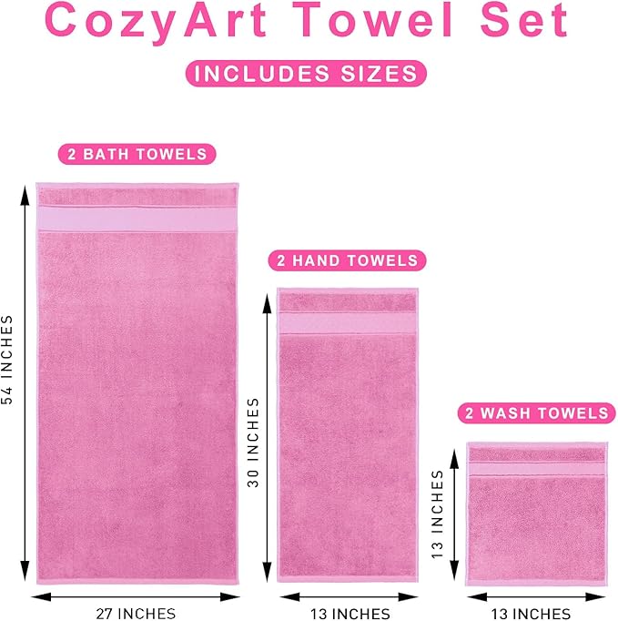 COZYART Pink Bath Towel Set 6 Piece, 2 Bath Towels 2 Hand Towels 2 Washcloths, Luxury 100% Turkish Cotton 650GSM Hotel Quality, Soft, Absorbent, Towel Sets for Bathroom