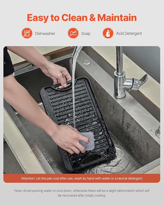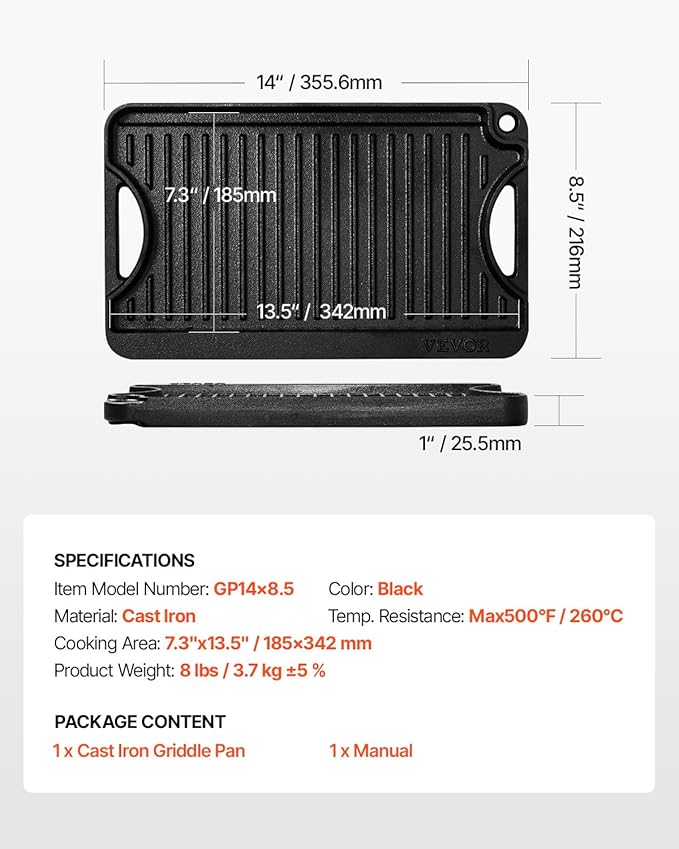 - Quality Cast Iron Construction: Made from durable cast iron, this griddle for gas grill can handle temperatures up to 500℉, giving you the freedom to cook at high heat. The two ergonomic loop handles ensure a secure, comfortable grip, making it easy to move the pan safely from stovetop to table
