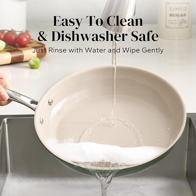 - COOL & STURDY HANDLE: Crafted from lightweight, precision-pressed stainless steel, this ergonomically designed handle ensures a comfortable grip. Double-riveted for exceptional strength and maneuverability, ceramic saute pan empowers you to seamlessly transition from stovetop to oven, allowing you to achieve that flawless sear, brown toppings, or even bake