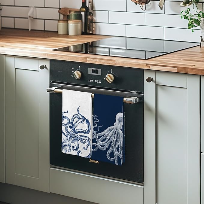 Coastal Octopus Beach Decor Dish Hand Tea Towels for Bathroom Kitchen, Octopus Ocean Nautical Beachy Bathroom Decor, Coastal Nautical Kitchen Towels and Dishcloths Sets of 2, 16x24 Inches