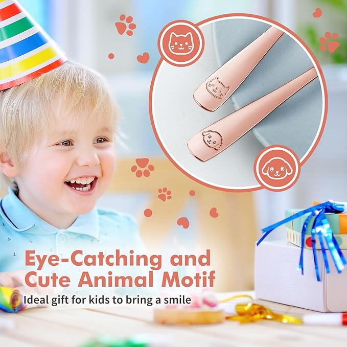 - ENGAGING MEALTIMES: Our kids silverware set embossed with a mirror-polished finish and adorable animal motifs. Your child will be excited to dine with a kitten on the spoon and a pup on the fork, turning mealtime into a fun and engaging experience