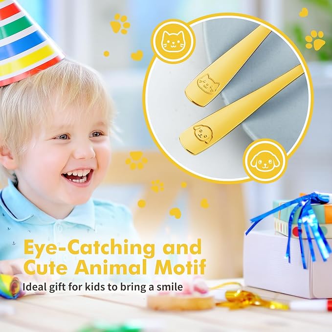 - ENGAGING MEALTIMES: Our kids silverware set embossed with a mirror-polished finish and adorable animal motifs. Your child will be excited to dine with a kitten on the spoon and a pup on the fork, turning mealtime into a fun and engaging experience