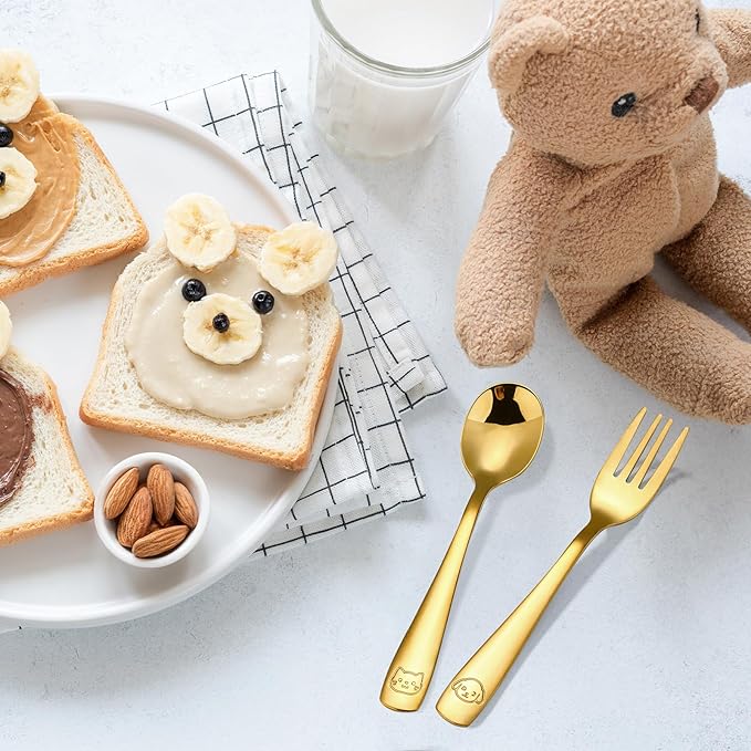 - IDEAL TRANSITIONAL CUTLERY: This set of 12 includes 6 kid forks and 6 kid spoons in gold. Ample quantity for daily needs by toddlers, kids, preschoolers, and school-age children, and allows for an easy transition to full-sized utensil