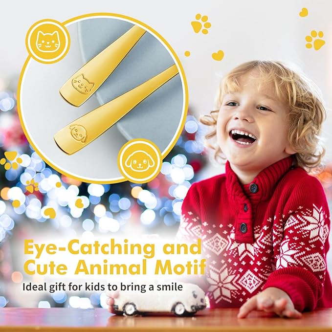 - ENGAGING MEALTIMES: Our kids silverware set embossed with a mirror-polished finish and adorable animal motifs. Your child will be excited to dine with a kitten on the spoon and a pup on the fork, turning mealtime into a fun and engaging experience