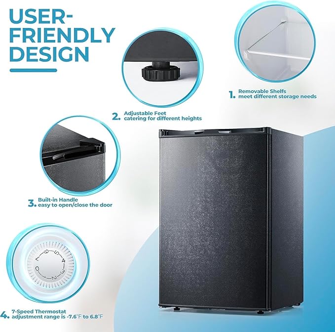 - 🧊ALL-ROUND FAST COOLING:3.0 Cu.ft high capacity upright freezer with powerful refrigeration. Faster and more thorough freezing, ten minutes of extremely fast freezing, to ensure the freshness of the ingredients. Compact Freezer is saving space design.Large Capacity is Great using for breast milk, meat, ice cream, aquatic products, cold drinks, quick-freezing and other purposes.Perfect for Home,Dorms,Kitchen and Office.
