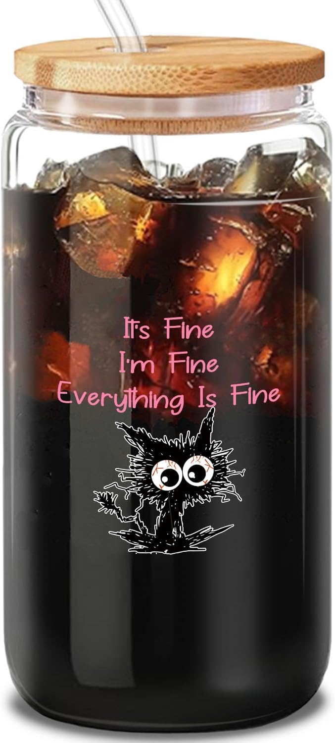 Pink Glass Tumbler Set with Straw, Cleaning Brush in Gift Box - Ideal Aesthetic Coffee Bar, Funny Cat Glass Cup Gifts-It's Fine I'm Fine - Present for Women Friends-16 Oz