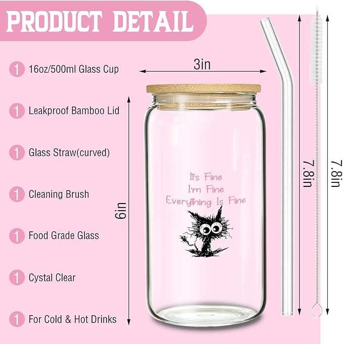 - Package content: This funny glass cup set includes a glass cup beautifully designed with a fun cat logo, a reusable straw and a straw cleaning brush. With an included gift box, this glass cup set can bring them a good laugh and ensure a delightful visual experience for the recipient.
