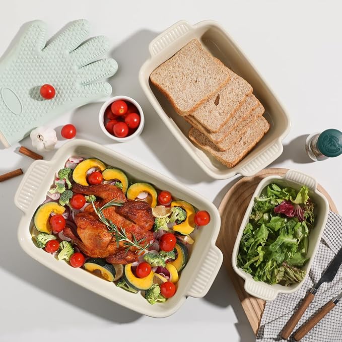 - Stackable and Easy to Clean - Baking dish sets can be stacked to save more kitchen cabinet space. Smooth glaze, easy to clean, you can wash it with soap or hot water, and dishwasher safe.